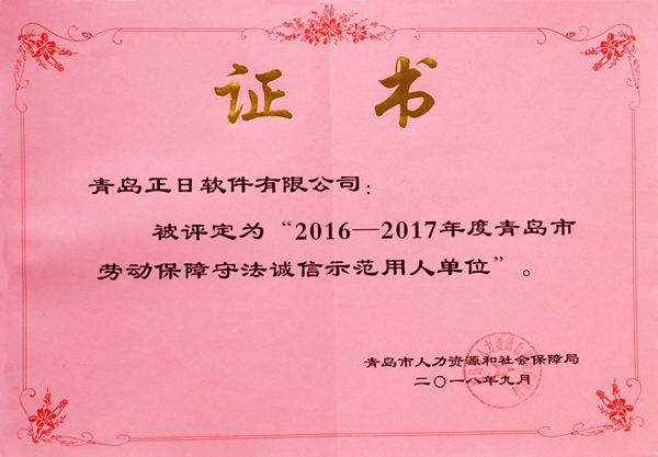 2018年3月,青島市開展了2016-2017年度勞動保障守法誠信示范用人單位評價活動,正日軟件參與了申報評選。青島市人社局本著公平、公正、公開的原則,對參評的698家用人單位進行評審。正日軟件在勞動合同履行、社會保險費繳納、規(guī)范用工行為等方面表現(xiàn)突出,獲得“2016-2017年度青島市勞動保障守法誠信示范用人單位”的榮譽稱號。