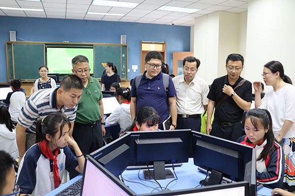 6月19日,山東省教科院信息技術教研員趙亮一行在青島市信息技術教研員陸德旭、紀毓選和總經理鞠紹兵的陪同下,來到北京師范大學青島城陽附屬學校Python抽測現場,就該校六年級學生的考試情況進行了巡視摸底。