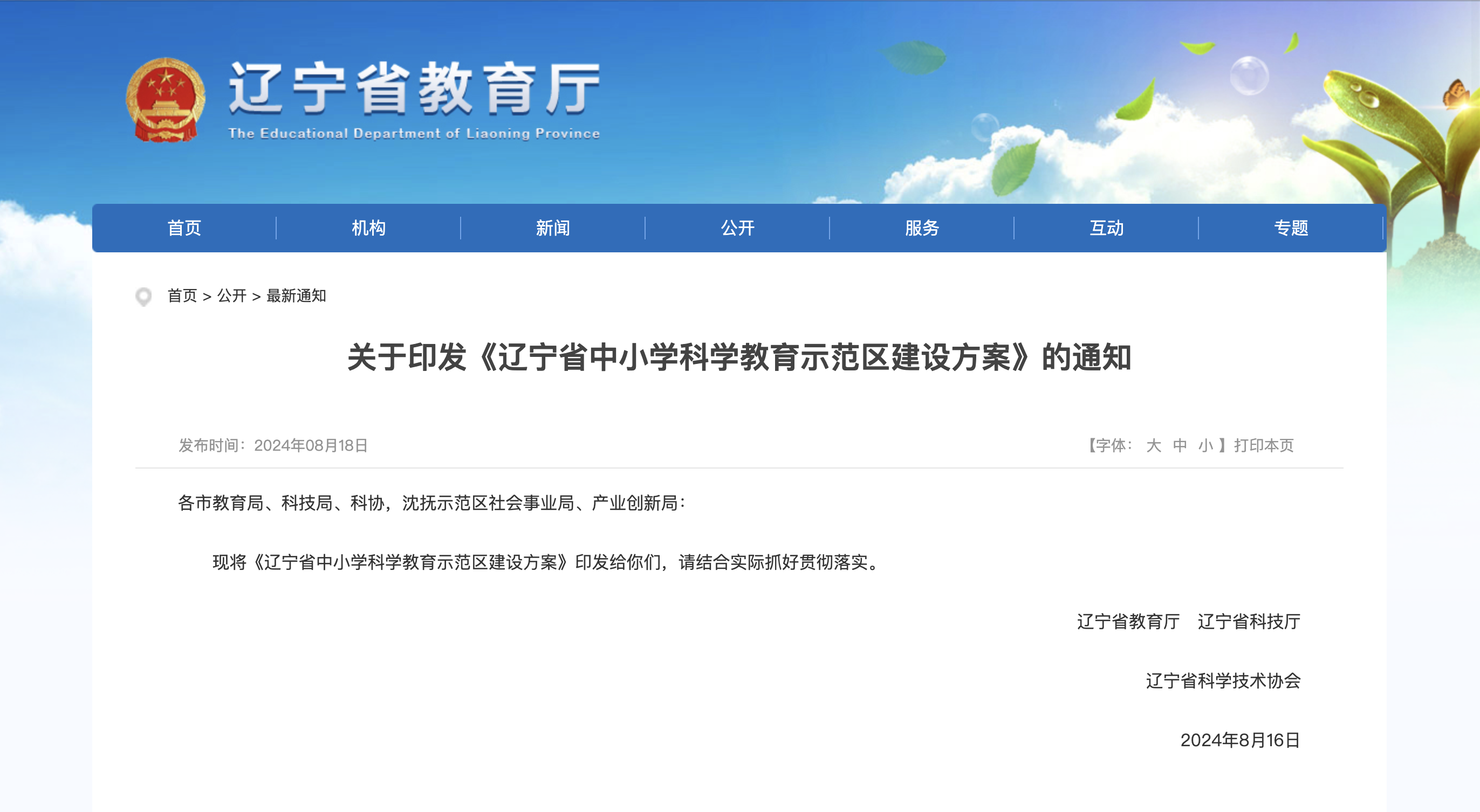 為深入貫徹習(xí)近平總書記關(guān)于在教育“雙減”中做好科學(xué)教育加法的重要指示精神,深入學(xué)習(xí)貫徹黨的二十大和二十屆三中全會(huì)精神,全面落實(shí)《教育部等十八部門關(guān)于加強(qiáng)新時(shí)代中小學(xué)科學(xué)教育工作的意見》《中共遼寧省委貫徹落實(shí)<中共中央關(guān)于進(jìn)一步全面深化改革、推進(jìn)中國式現(xiàn)代化的決定>的意見》,以及教育部、遼寧省部省會(huì)商會(huì)議精神,打造遼寧省中小學(xué)科學(xué)教育示范區(qū),形成具有遼寧特色的科學(xué)教育品牌,切實(shí)發(fā)揮示范引領(lǐng)作用,推動(dòng)科學(xué)教育高質(zhì)量發(fā)展,助力教育強(qiáng)省建設(shè)。