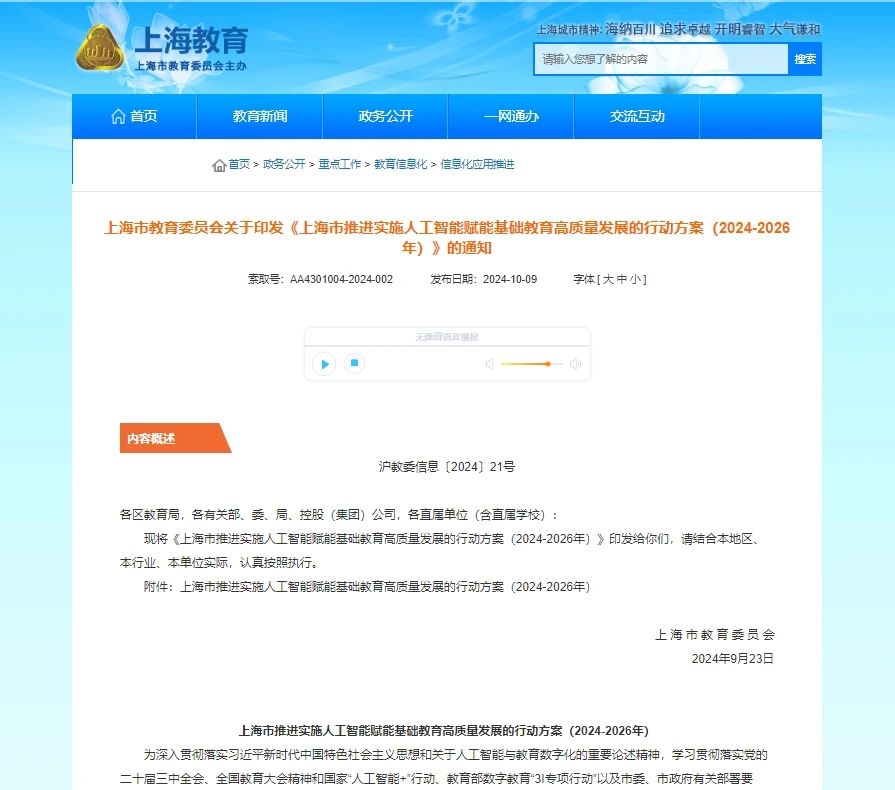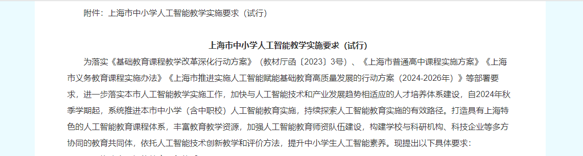 實施要求明確,自2024年秋季學(xué)期起,系統(tǒng)推進本市中小學(xué)(含中職校)人工智能教育實施,持續(xù)探索人工智能教育實施的有效路徑。