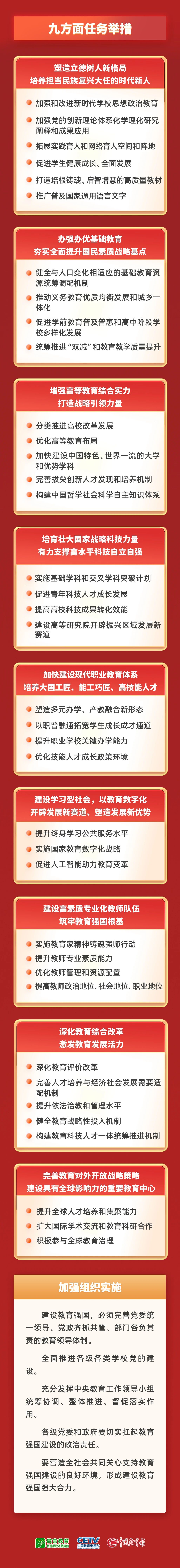 十一是加強(qiáng)組織實(shí)施。要求完善黨委統(tǒng)一領(lǐng)導(dǎo)、黨政齊抓共管、部門各負(fù)其責(zé)的教育領(lǐng)導(dǎo)體制,全面推進(jìn)各級各類學(xué)校黨的建設(shè)。充分發(fā)揮中央教育工作領(lǐng)導(dǎo)小組作用,各級黨委和政府要切實(shí)扛起教育強(qiáng)國建設(shè)的政治責(zé)任,形成建設(shè)教育強(qiáng)國強(qiáng)大合力。