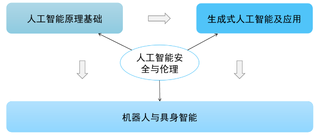 本方案將中小學人工智能教育劃分為“認知、應用、創(chuàng)新”三個階段,將課程內(nèi)容劃分為人工智能原理基礎(chǔ)(幫助學生理解AI基本概念與主要技術(shù))、生成式人工智能及應用(探索語言大模型和多模態(tài)技術(shù)的現(xiàn)實應用)、機器人與具身智能(從硬件搭建到智能交互,形成完整實踐鏈條)、人工智能安全與倫理(貫穿其它三部分教學過程,引導學生思考技術(shù)治理與社會責任)四個部分。這四部分之間的關(guān)系如下圖所示: