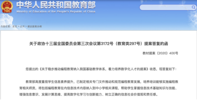 近日,教育部在給全國(guó)政協(xié)委員的答復(fù)函中稱,教育部高度重視學(xué)生信息素養(yǎng)提升,已制定相關(guān)專門文件推動(dòng)和規(guī)范編程教育發(fā)展,培養(yǎng)培訓(xùn)能夠?qū)嵤┚幊探逃嚓P(guān)師資,將包括編程教育在內(nèi)信息技術(shù)內(nèi)容納入中小學(xué)相關(guān)課程,幫助學(xué)生掌握信息技術(shù)基礎(chǔ)知識(shí)與技能、增強(qiáng)信息意識(shí)、發(fā)展計(jì)算思維、提高數(shù)字化學(xué)習(xí)與創(chuàng)新能力、樹立正確的信息社會(huì)價(jià)值觀和責(zé)任感。