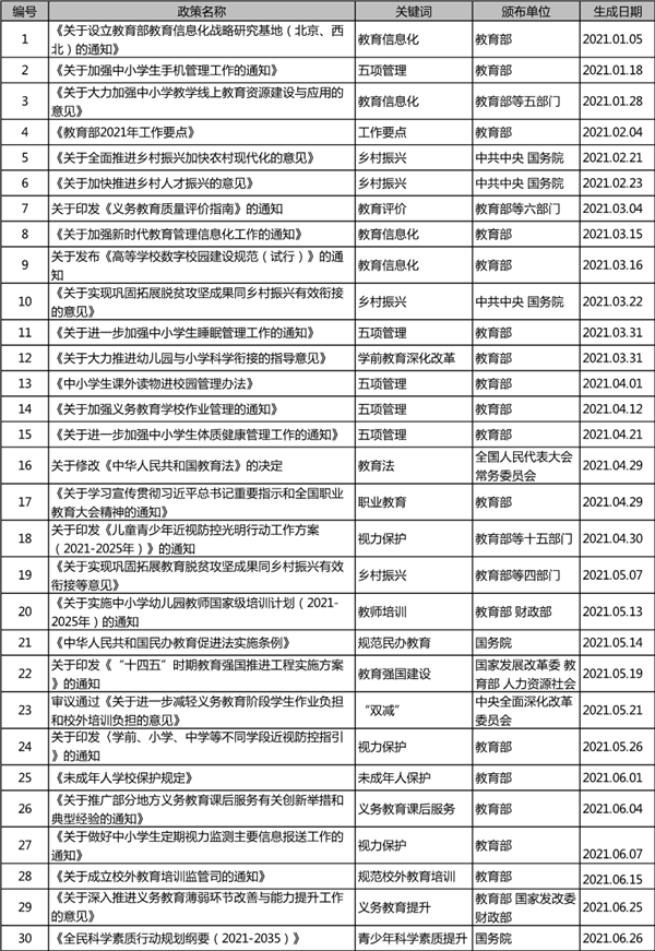除以上五方面重要主題之外,上半年還出臺(tái)了教育信息化、教師培訓(xùn)、青少年科學(xué)素質(zhì)提升等方面的重要政策,對(duì)照《教育部2021年工作要點(diǎn)》部署的工作主線和重點(diǎn)任務(wù),這些領(lǐng)域的政策預(yù)計(jì)在下半年還會(huì)有重磅的規(guī)劃性文件或落實(shí)舉措出臺(tái),并且在高等教育提質(zhì)創(chuàng)新、高水平教育對(duì)外開(kāi)放、精品教材建設(shè)、家校社協(xié)同育人、普通高中多樣化特色發(fā)展等方面也將陸續(xù)有重要政策出臺(tái),以新的發(fā)展理念和發(fā)展模式,全面深化改革,推動(dòng)教育高質(zhì)量發(fā)展。