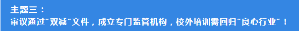1月7日,陳寶生部長(zhǎng)在全國(guó)教育工作會(huì)議上采用非常嚴(yán)厲的措辭表示:“2021年,要大力度治理整頓校外培訓(xùn)機(jī)構(gòu)。這件事非辦不可,必須主動(dòng)作為!”3月5日,兩會(huì)召開(kāi),規(guī)范治理校外培訓(xùn)成為兩會(huì)提案熱點(diǎn)中的熱點(diǎn),多位代表提出建議:統(tǒng)籌各方力量,系統(tǒng)治理整頓校外培訓(xùn)機(jī)構(gòu),減輕學(xué)生和家長(zhǎng)負(fù)擔(dān)。5月21日,中央全面深化改革委員會(huì)十九次會(huì)議審議通過(guò)了《關(guān)于進(jìn)一步減輕義務(wù)教育階段學(xué)生作業(yè)負(fù)擔(dān)和校外培訓(xùn)負(fù)擔(dān)的意見(jiàn)》,會(huì)議強(qiáng)調(diào),要全面規(guī)范管理校外培訓(xùn)機(jī)構(gòu),堅(jiān)持從嚴(yán)治理,不能讓良心的行業(yè)變成逐利的產(chǎn)業(yè)。6月1日,國(guó)家市場(chǎng)監(jiān)督管理總局召開(kāi)新聞發(fā)布會(huì),介紹市場(chǎng)監(jiān)督部門(mén)對(duì)15家校外培訓(xùn)機(jī)構(gòu)分別予以頂格罰款,共計(jì)3650萬(wàn)元。6月15日,教育部召開(kāi)啟動(dòng)會(huì),宣布成立“校外教育培訓(xùn)監(jiān)管司”,傳遞出徹底解決校外培訓(xùn)監(jiān)管難的決心。各類信息的傳遞,以及各地出臺(tái)的非常嚴(yán)厲的治理舉措,不僅引起全社會(huì)的高度關(guān)注,更引起了教培行業(yè)的巨大震動(dòng)。