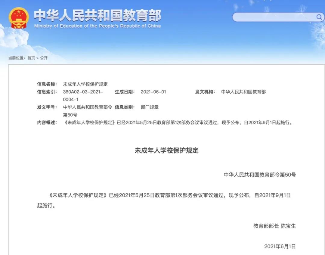 6月1日,教育部舉辦新聞發(fā)布會,時(shí)任教育部部長陳寶生簽發(fā)了第50號教育部令,頒布《未成年人學(xué)校保護(hù)規(guī)定》(以下簡稱《規(guī)定》)。