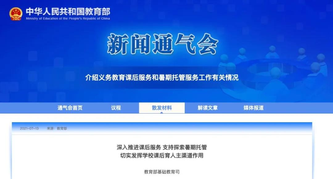 7月13日下午,教育部舉行新聞通氣會,介紹義務(wù)教育課后服務(wù)和暑期托管服務(wù)工作有關(guān)情況。教育部基礎(chǔ)司司長的發(fā)言明確:今秋推行一校一案課后服務(wù),推行課后服務(wù)5+2模式。