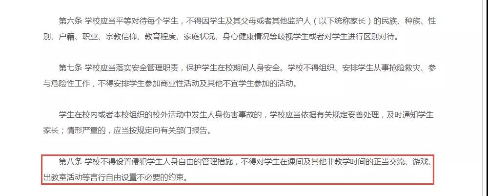 第八條 學(xué)校不得設(shè)置侵犯學(xué)生人身自由的管理措施,不得對學(xué)生在課間及其他非教學(xué)時(shí)間的正當(dāng)交流、游戲、出教室活動等言行自由設(shè)置不必要的約束。