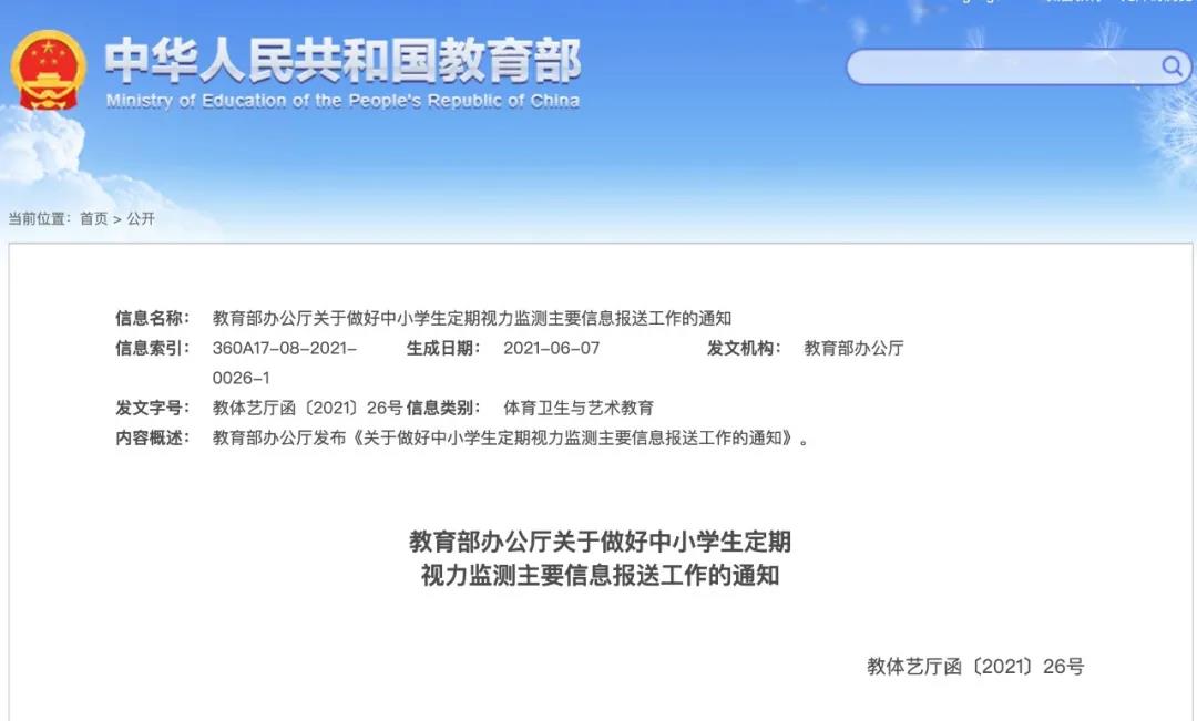 6月3日,教育部印發(fā)《關(guān)于做好中小學(xué)生定期視力監(jiān)測主要信息報(bào)送工作的通知》,切實(shí)落實(shí)學(xué)生健康體檢制度和視力監(jiān)測制度。
