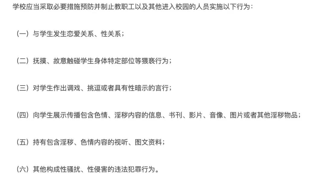 《規(guī)定》中第三章第二十四條規(guī)定: 學(xué)校應(yīng)當(dāng)建立健全教職工與學(xué)生交往行為準(zhǔn)則、學(xué)生宿舍安全管理規(guī)定、視頻監(jiān)控管理規(guī)定等制度,建立預(yù)防、報(bào)告、處置性侵害、性騷擾工作機(jī)制。