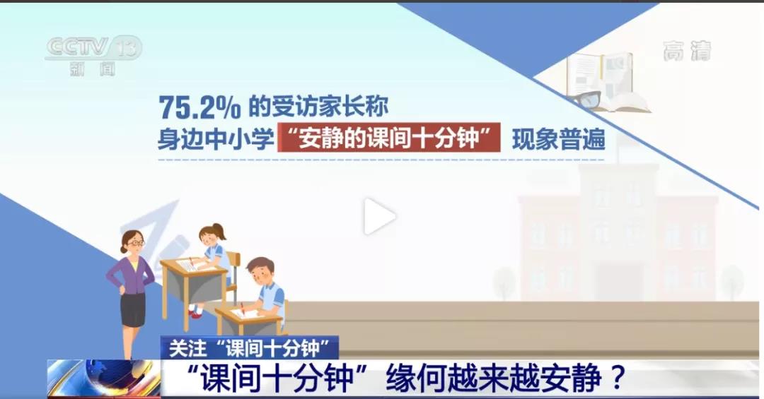 調(diào)查顯示,77.2%的小學(xué)生課間十分鐘很安靜,初中的比例為69.8%。在小學(xué),課間可能變成了“不出教學(xué)樓”“不能跑跳”。在中學(xué),課間總是拖堂,直接就連到了下節(jié)課。大多數(shù)學(xué)校還都安排了課間值日生,最重要的工作是制止同學(xué)們喧嘩、跑跳、打逗。