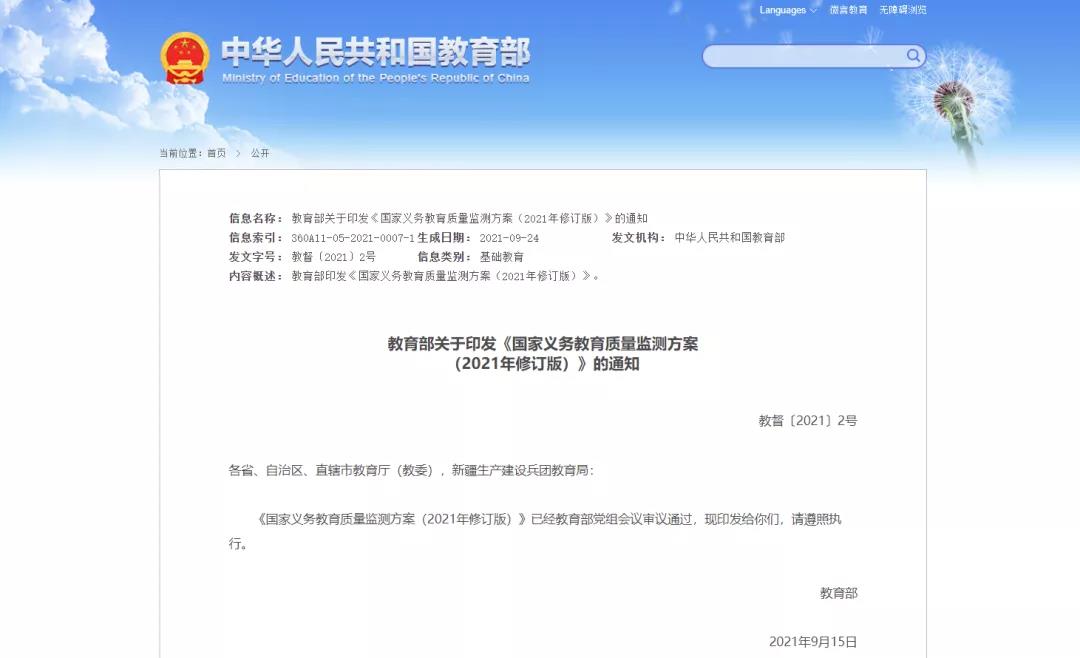 教育部關于印發(fā)《國家義務教育質量監(jiān)測方案(2021年修訂版)》的通知