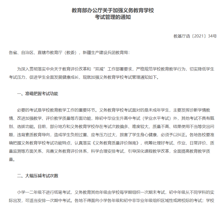 《通知》指出,義務(wù)教育階段的考試主要發(fā)揮診斷學(xué)情教情、改進加強教學(xué)、評價教學(xué)質(zhì)量等方面功能,除初中畢業(yè)生升高中考試(學(xué)業(yè)水平考試)外,其他考試不具有甄別選拔功能。各地不得面向小學(xué)各年級和初中非畢業(yè)年級組織區(qū)域性或跨校際的考試,學(xué)校和班級不得組織周考、月考、單元考試等其他各類考試,也不得以測試、測驗、限時練習(xí)、學(xué)情調(diào)研等各種名義變相組織考試。初中畢業(yè)年級可在下學(xué)期正常完成課程教學(xué)任務(wù)后,在總復(fù)習(xí)階段組織一至兩次模擬考試,但堅決禁止搶趕教學(xué)進度、提前結(jié)課備考。大幅壓減考試次數(shù)的要求率先在中央和各?。▍^(qū)、市)確定的“雙減”試點地區(qū)開展,積極進行探索試驗。