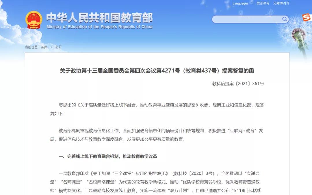 您提出的《關(guān)于高質(zhì)量做好線上線下融合,推動(dòng)教育事業(yè)健康發(fā)展的提案》收悉,經(jīng)商工業(yè)和信息化部,現(xiàn)答復(fù)如下: