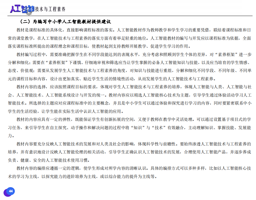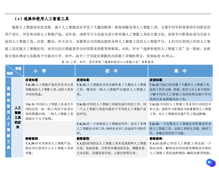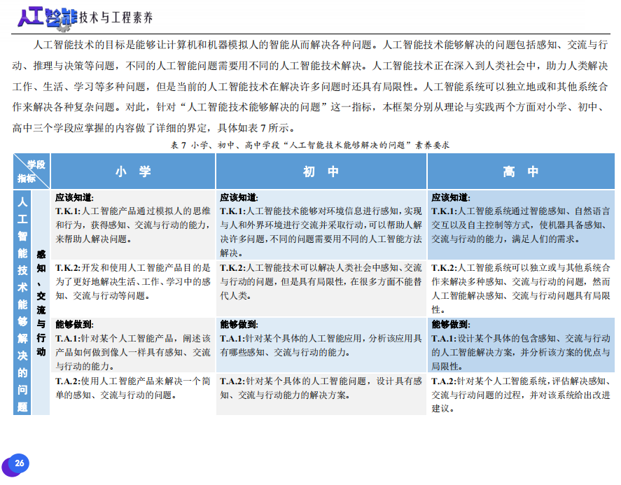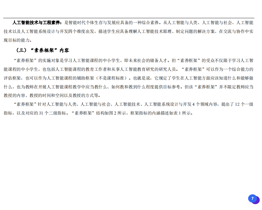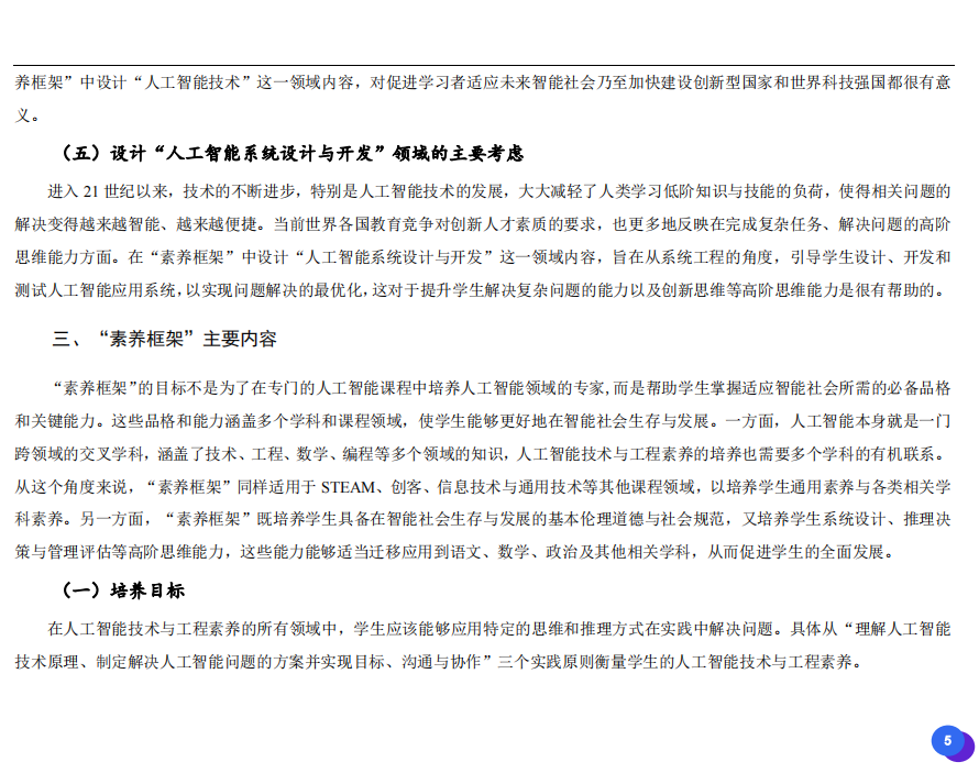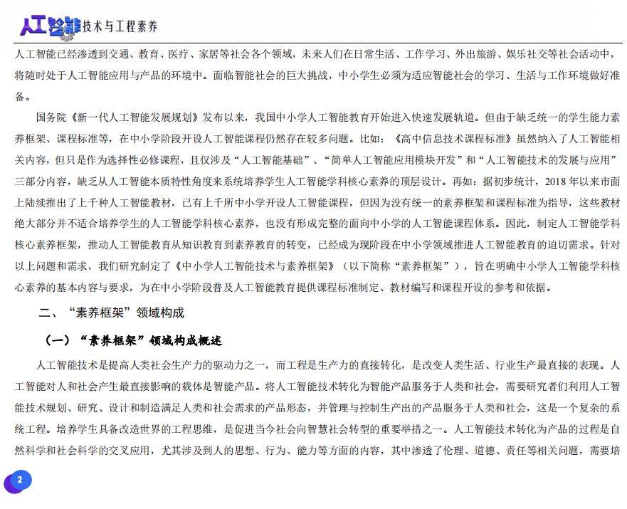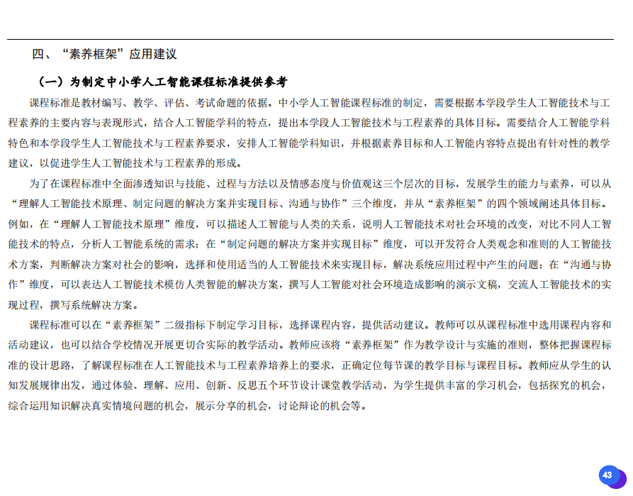 此次發(fā)布的《素養(yǎng)框架》包含人工智能與人類、人工智能與社會、人工智能與技術、人工智能系統(tǒng)設計與開發(fā)四個領域,可為中小學普及人工智能教育的標準制定、教材編寫、課程開設、素養(yǎng)評價提供重要參考,將推動人工智能教育從知識教育向素養(yǎng)教育的轉變?!端仞B(yǎng)框架》發(fā)布后,將不斷吸收有關意見和建議,逐步完善和更新。