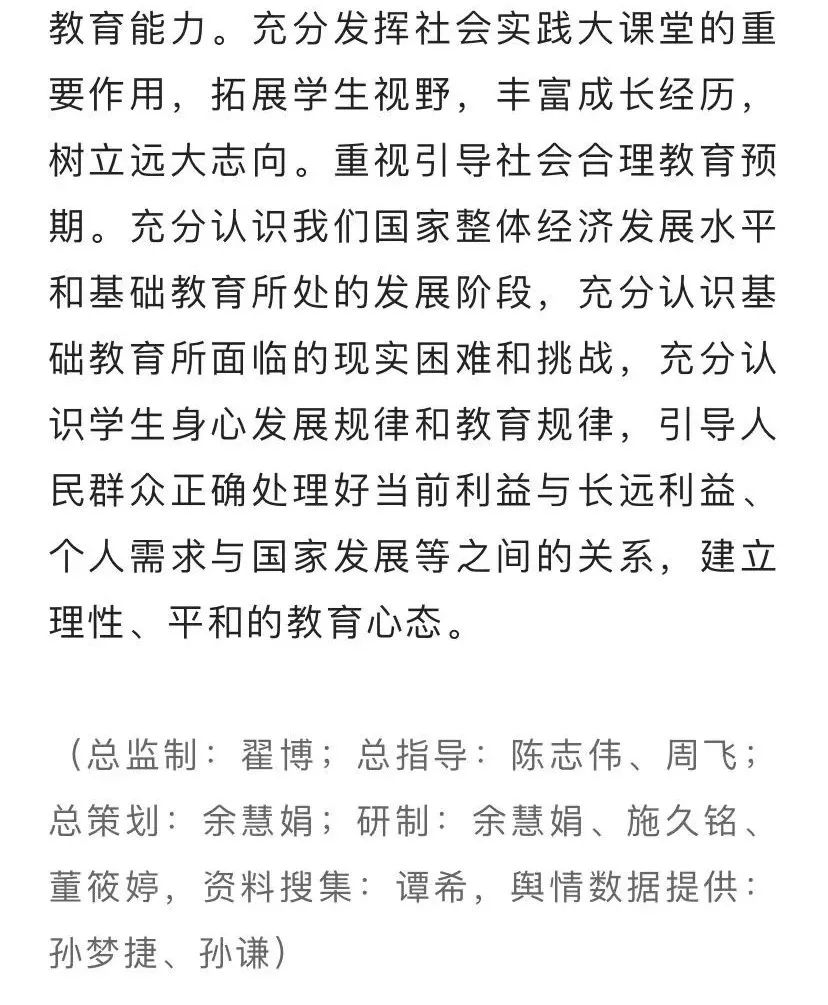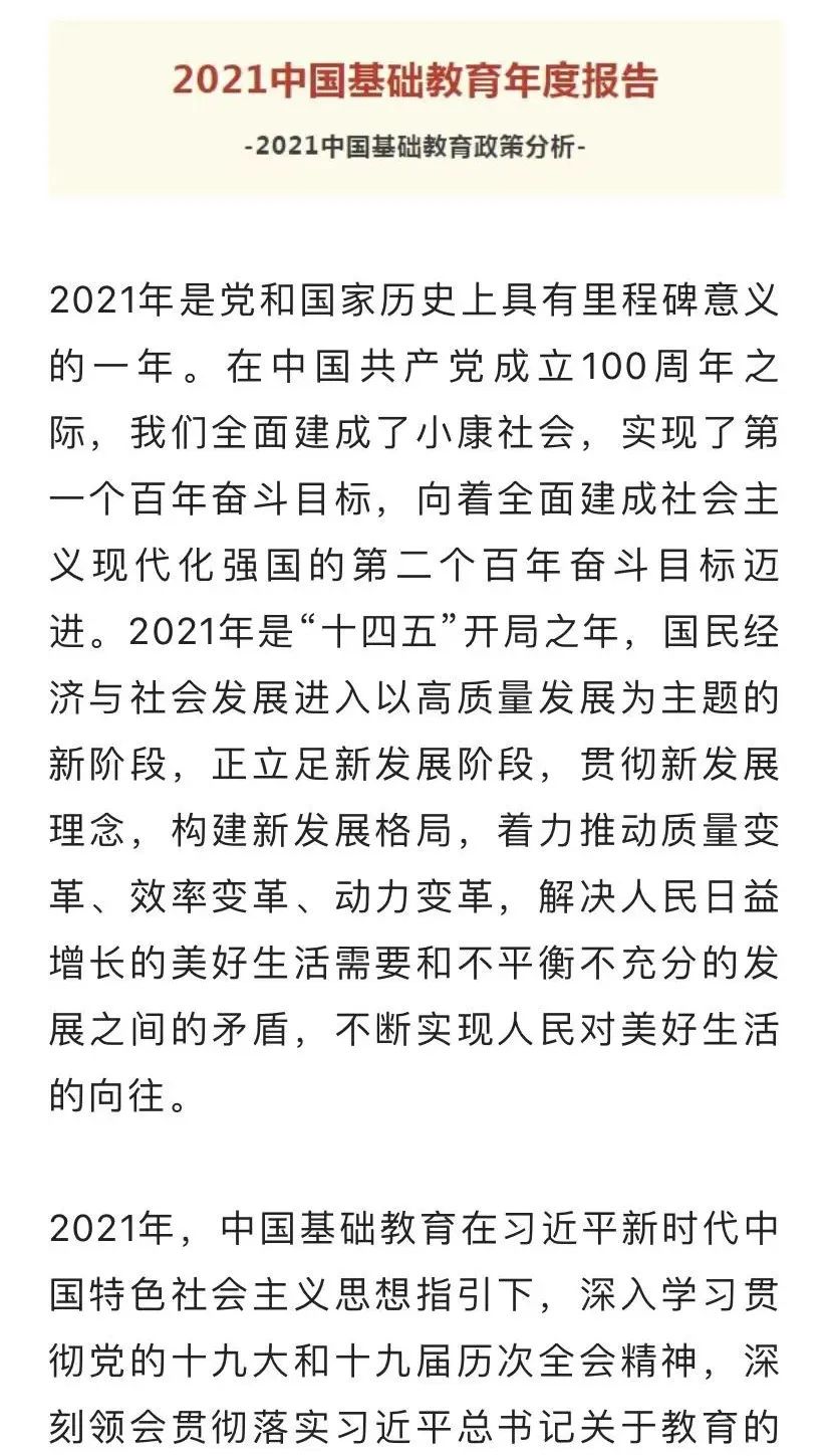 本次《中國基礎(chǔ)教育年度報告》,分為中國基礎(chǔ)教育政策分析、中國基礎(chǔ)教育研究前沿與熱點、中國中小學(xué)教育新進(jìn)展新趨勢、中國基礎(chǔ)教育典型案例四個子報告組成,力圖在分析政策中把握價值導(dǎo)向,在聚焦研究前沿中把握發(fā)展趨勢,在關(guān)注實踐探索中把握新鮮經(jīng)驗。