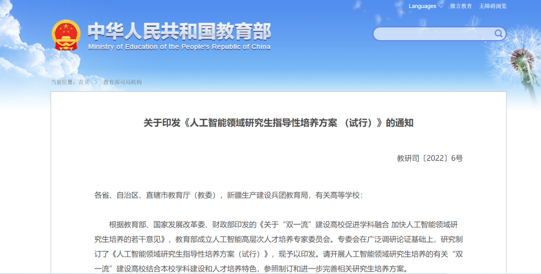 日前,教育部學(xué)位管理與研究生教育司發(fā)布《關(guān)于印發(fā)《人工智能領(lǐng)域研究生指導(dǎo)性培養(yǎng)方案 (試行)》的通知》。