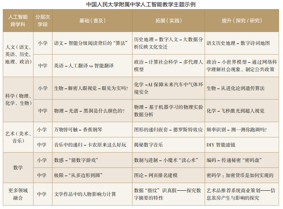 學(xué)科交叉融合是當(dāng)前科學(xué)技術(shù)發(fā)展的重大特征,是新學(xué)科產(chǎn)生的重要源泉,是培養(yǎng)創(chuàng)新型人才的有效路徑,其核心是真實問題解決。人工智能本身是一個跨學(xué)科綜合的領(lǐng)域,交叉計算機(jī)科學(xué)、數(shù)學(xué)、生物學(xué)、神經(jīng)科學(xué)、認(rèn)知科學(xué)、腦科學(xué)、心理學(xué)、社會學(xué)、哲學(xué)等,也符合STEAM教育的框架與理念。在具體教學(xué)中,要依托大視野、大概念、大思維,綜合考慮人工智能的學(xué)科基礎(chǔ)、核心思想、內(nèi)涵外延,挖掘人工智能與其他學(xué)科的交叉創(chuàng)新點(diǎn)。人工智能的跨學(xué)科特性不僅有利于促進(jìn)學(xué)科整合,也催生了多學(xué)科教師聯(lián)合跨學(xué)科教學(xué)的新模式。例如中國人民大學(xué)附屬中學(xué)開發(fā)的“橫向跨學(xué)科縱向分層次”的人工智能+X跨學(xué)科課程體系,是打破學(xué)科界限、激發(fā)學(xué)生創(chuàng)新思維、發(fā)展學(xué)生高階能力的有益嘗試(見上表)。