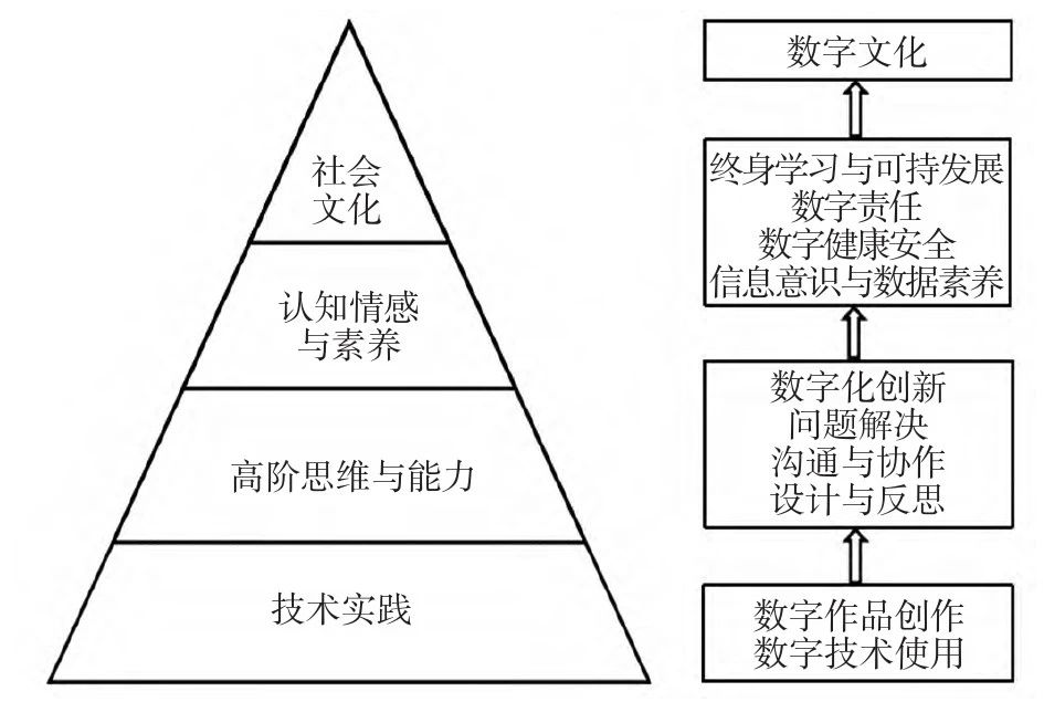 在扎根技術(shù)實踐、高階思維能力與認知情感素養(yǎng)的基礎(chǔ)上,人類會形成富有智慧結(jié)晶的數(shù)字文化。數(shù)字文化不僅是數(shù)字經(jīng)濟時代人與人、機器、社會之間的相互關(guān)系與作用模式,更是駕馭數(shù)字技術(shù)、發(fā)展高階品質(zhì)、根植道德信念,謀求個人、社會進步發(fā)展與價值實現(xiàn)的至高境界。
