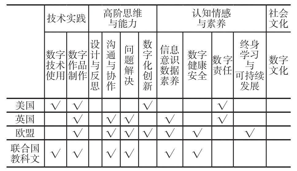 比較分析上述代表性數(shù)字素養(yǎng)框架,提煉出“技術(shù)實踐—高階思維與能力—認知情感與素養(yǎng)—社會文化”結(jié)構(gòu)脈絡,并以此比較出美國、英國、歐盟和聯(lián)合國教科文組織四種領(lǐng)域代表性的數(shù)字素養(yǎng)框架差異,如表1所示。