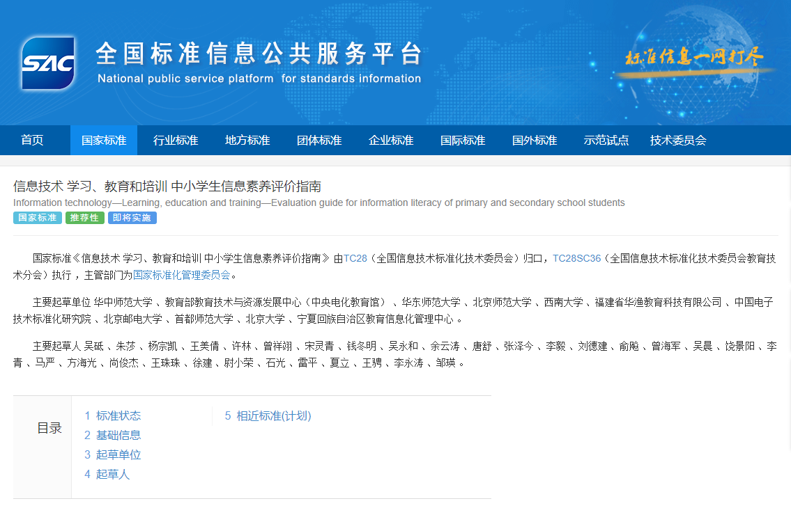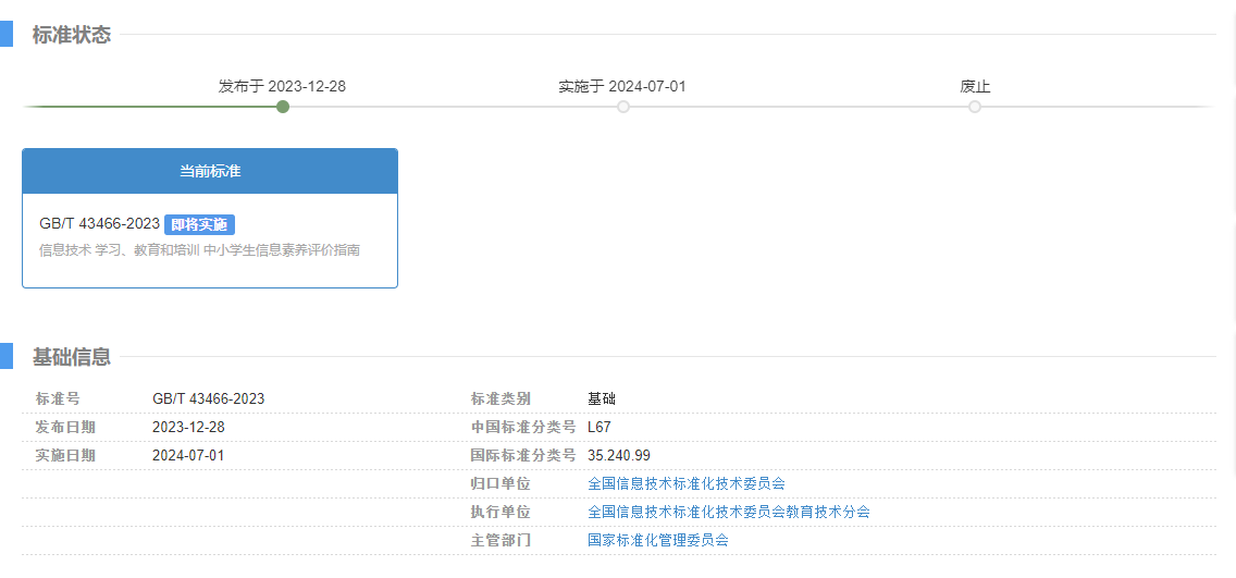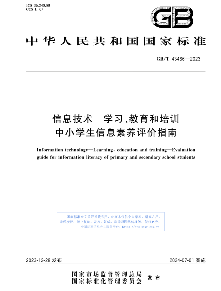 信息素養(yǎng)評(píng)價(jià)是衡量人才綜合素質(zhì)的一項(xiàng)重要指標(biāo)、是培養(yǎng)符合信息時(shí)代需求人才隊(duì)伍的基礎(chǔ)與前提,建立科學(xué)、規(guī)范、準(zhǔn)確的評(píng)價(jià)體系有利于學(xué)生能力提升,也對(duì)改進(jìn)教育問題、促進(jìn)教育創(chuàng)新、提高教育質(zhì)量、貫徹落實(shí)教育信息化相關(guān)政策有重要意義。2023年底,國(guó)家市場(chǎng)監(jiān)督管理總局、國(guó)家標(biāo)準(zhǔn)化管理委員會(huì)分別發(fā)布《GB/T 43438-2023信息技術(shù) 學(xué)習(xí)、教育和培訓(xùn) 中小學(xué)教師信息素養(yǎng)評(píng)價(jià)指南》、《GB/T 43466-2023信息技術(shù) 學(xué)習(xí)、教育和培訓(xùn)中小學(xué)生信息素養(yǎng)評(píng)價(jià)指南》國(guó)家標(biāo)準(zhǔn),該標(biāo)準(zhǔn)由全國(guó)信息技術(shù)標(biāo)準(zhǔn)化技術(shù)委員會(huì)歸口,全國(guó)信息技術(shù)標(biāo)準(zhǔn)化技術(shù)委員會(huì)教育技術(shù)分會(huì)執(zhí)行 ,主管部門為國(guó)家標(biāo)準(zhǔn)化管理委員會(huì)。兩項(xiàng)標(biāo)準(zhǔn)分別將于2024年6月1日和2024年7月1日正式實(shí)施。一起隨中小學(xué)信息素養(yǎng)評(píng)測(cè)小編看看吧——