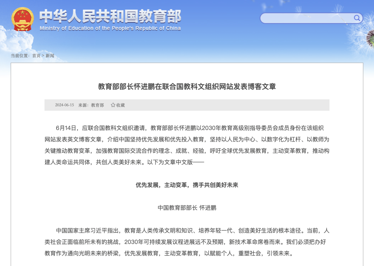 文章來(lái)源:教育部官網(wǎng),原文題目為“教育部部長(zhǎng)懷進(jìn)鵬在聯(lián)合國(guó)教科文組織網(wǎng)站發(fā)表博客文章”