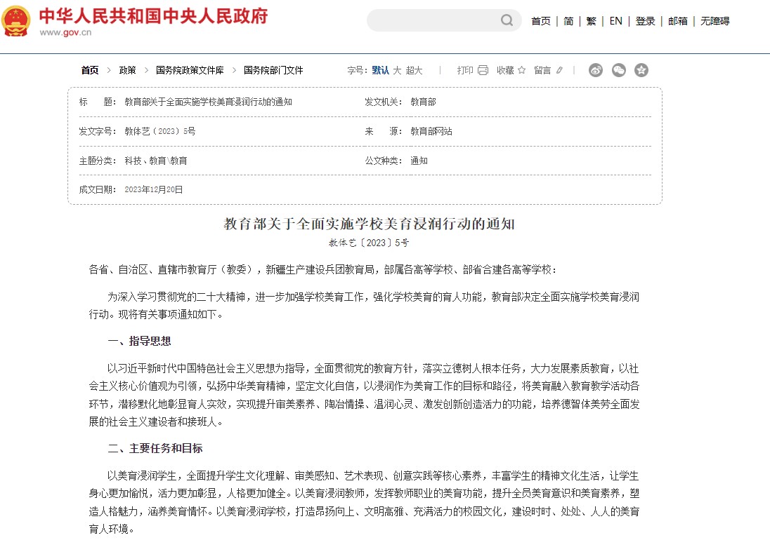 教育部印發(fā)《關于全面實施學校美育浸潤行動的通知》(教體藝〔2023〕5號),全面實施學校美育浸潤行動,包括實施美育教學改革深化行動、美育評價機制優(yōu)化行動等,進一步加強學校美育工作,強化學校美育的育人功能。此文件也為未來一段時間內(nèi),各個層面美育工作的開展指明了方向。加之之前《關于全面加強和改進新時代學校美育工作的意見》文件內(nèi)容,藝術素質(zhì)測評的實施,有助于推動學校開足開齊藝術相關課程及促進教育教學改革相關工作。