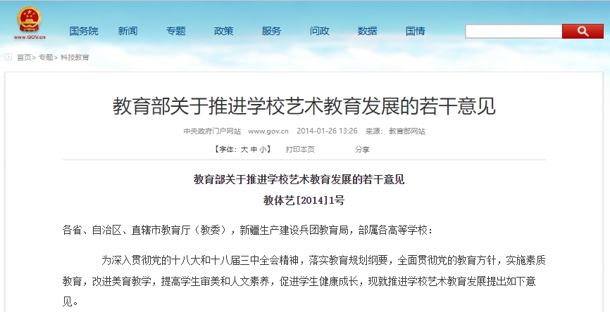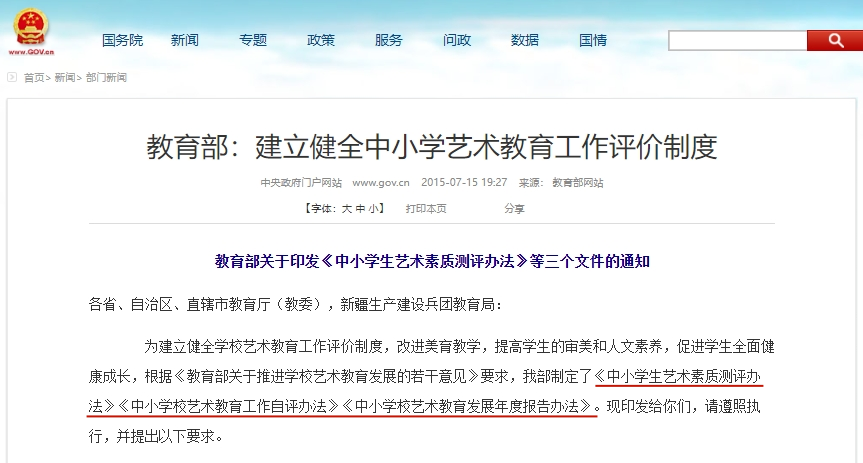 2015年,相繼印發(fā)了《中小學(xué)生藝術(shù)素質(zhì)測評辦法》、《中小學(xué)校藝術(shù)教育工作自評辦法》、《中小學(xué)學(xué)校藝術(shù)教育發(fā)展年度報告辦法》三個文件。