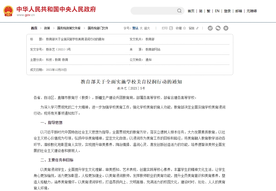 2023年,教育部印發(fā)《關(guān)于全面實施學(xué)校美育浸潤行動的通知》,明確深化美育評價改革,發(fā)揮評價的牽引和導(dǎo)向作用,完善初高中藝術(shù)科目學(xué)業(yè)水平考試,將美育評價納入學(xué)生綜合素質(zhì)檔案。一起來回顧近幾年出臺的美育相關(guān)政策與措施: