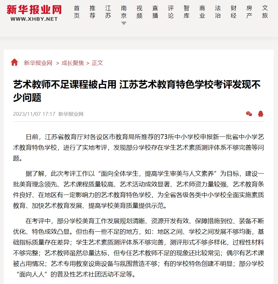 各地市在探索藝術(shù)考試、推動藝術(shù)中考實施等工作上取得一定成效,但在推動過程中也發(fā)現(xiàn)一些問題。例如2023年,江蘇省教育廳實地考評了新一批申報省中小學(xué)藝術(shù)教育特色的73所學(xué)校,發(fā)現(xiàn)部分學(xué)校存在學(xué)生藝術(shù)素質(zhì)測評體系不夠完善、測評形式不夠多樣化、過程性材料不夠完整等問題。
