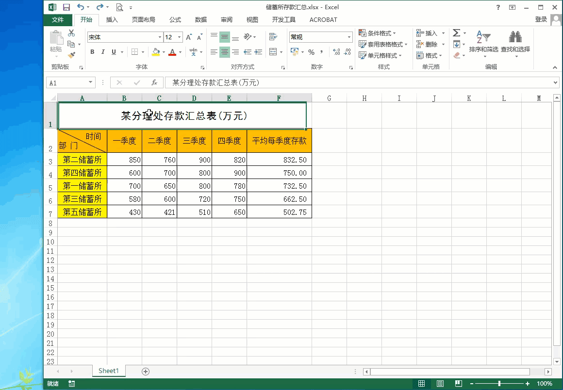 選中單元格區(qū)域A2:F7,在開始選項卡的編輯功能區(qū)中,左鍵點擊排序和篩選,在下拉菜單中左鍵點擊自定義排序。在排序對話框中,啟用數(shù)據(jù)包含標題,將主要關鍵字設置為“平均每季度存款“,將次序設置為降序,左鍵單擊確定按鈕完成排序。
